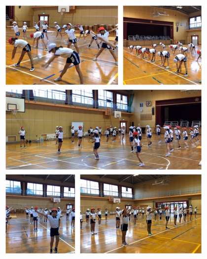 準備運動は、音楽に合わせてなわとびジャンプ体操、引き続き、ラジオ体操第1です。校長先生に見ていただいて、アドバイスをしていただきました。もっと自分の体と対話しながら、大きな動きをすること。滑らかな動きになるようにもっとリラックスすること。