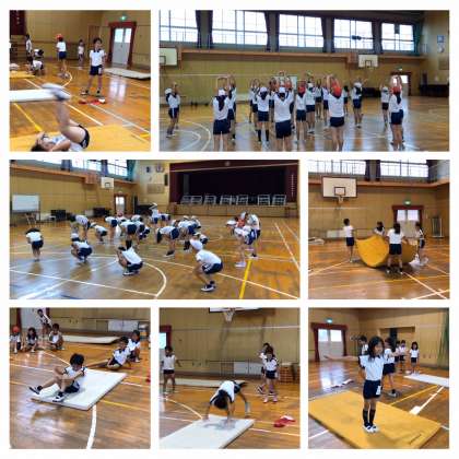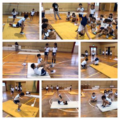 体操競技が専門の校長先生に練習の方法を伝授してもらいました。ゆりかごから背倒立、スピードをつけられる前転を練習します。後転もスピードをつけるポイントを教えてもらって繰り返し練習します。繰り返し練習することで、とてもスムーズな前転・後転になってきています。