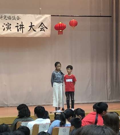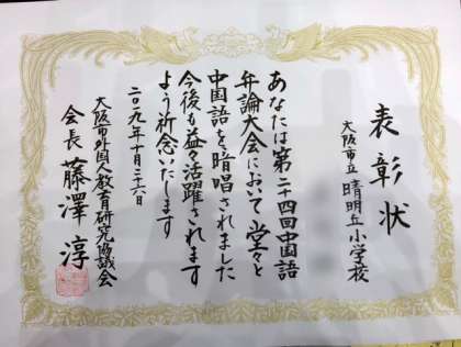 10/26(土)、大阪府立難波支援学校にて中国語弁論大会が開かれました。本校からは、4年生の2名の子どもたちが参加しました。今日までに、発表内容を何度も繰り返し練習してきました。その成果を発揮して、堂々とした姿勢でハキハキと発表することができました。会場から大きな拍手をもらったことで、とても満足した表情を見せてくれた子どもたちでした!