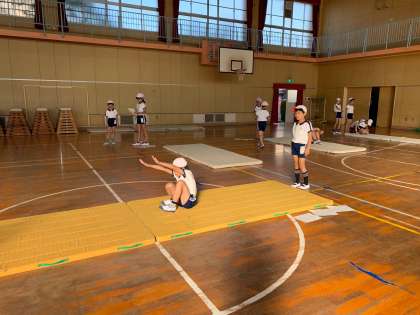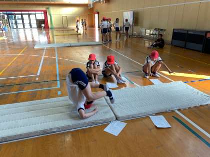 前転で手をつかずに起き上がる⇒ひざをとじて前転する⇒ひざを伸ばして前転する⇒立った状態から前転する、の順でステップアップをしていきます。