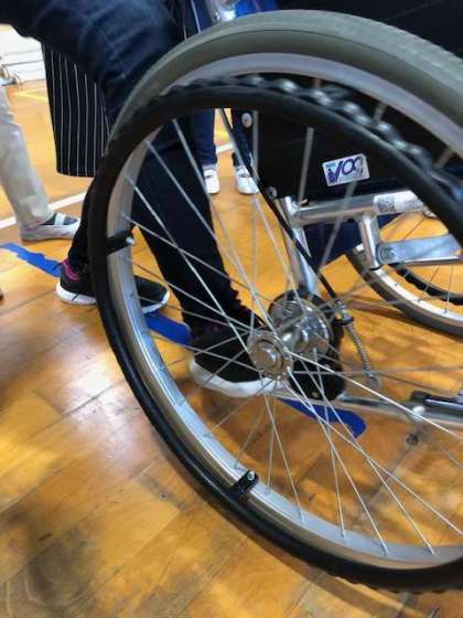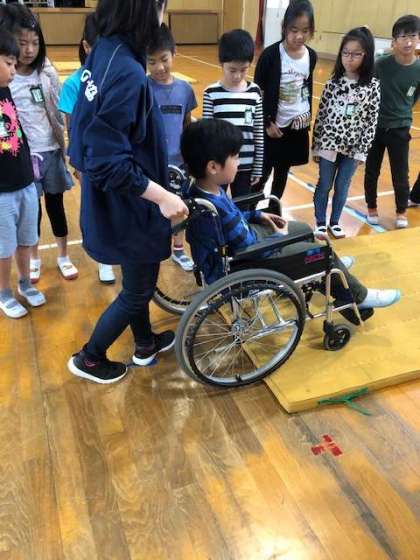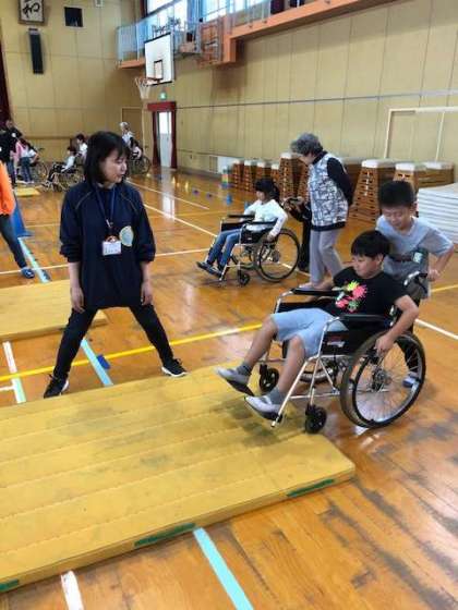 体育で使用するマットは、厚さが5cmほどです。日常的に5cmほどの段差を越えることに苦労を感じる事のない子どもたちにとって、車椅子を使ったこの体験は、驚きだったようです。