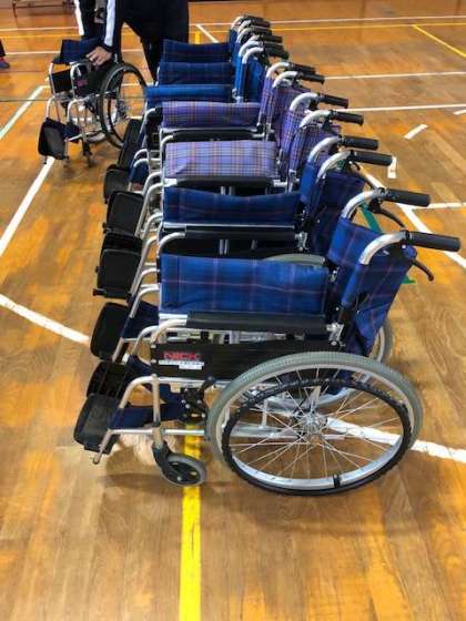 まずは、2人ペアを組んで、車椅子に乗る人と押す人(サポートする人)に分かれます。挨拶をして、車椅子の使い方を学びます。