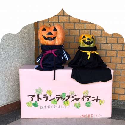 地域園芸クラブのみなさんが、自然観察園で育てたカボチャを使って作っていただきました。アトランティックジャイアントと呼ばれるカボチャで、巨大なカボチャとして知られているようです。