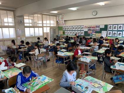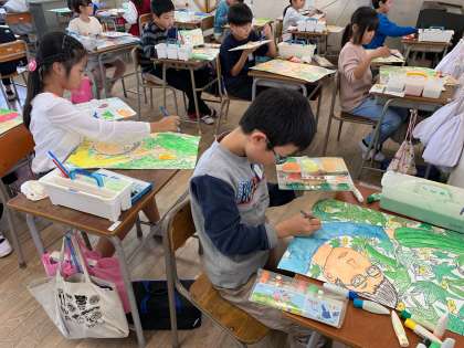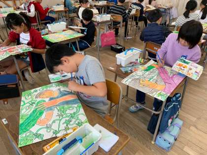 絵の具を使って、絵の色ぬりです。