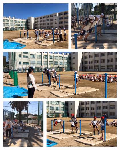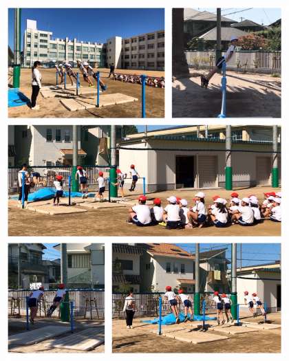 3組は、前回りの練習。腕立て支持の姿勢から、前方へスムーズに回転する練習。女子児童がとても上手な前回りを模範演技。体を大きく使った回転運動ができています。コツがつかめるまで、繰り返し練習することです。