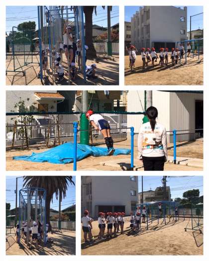 11月5日(火)3時間目、2年3組の体育です。2組と交替しながら低鉄棒と雲梯と登り棒に取り組んでいました。