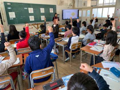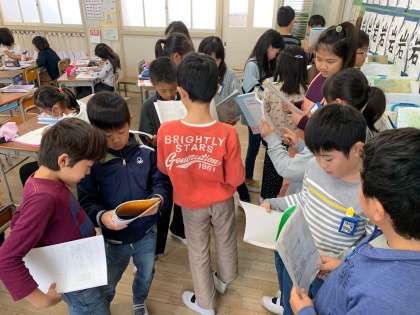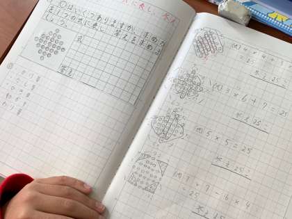 一つの問題に対してたくさんの考え方をノートにまとめ、まとめ終わった児童から、教室の後方で多くの友達に説明をしていきます。