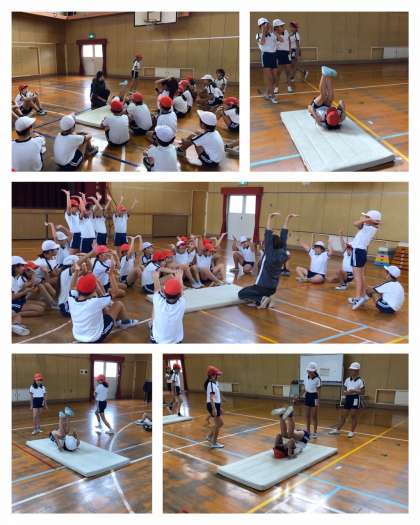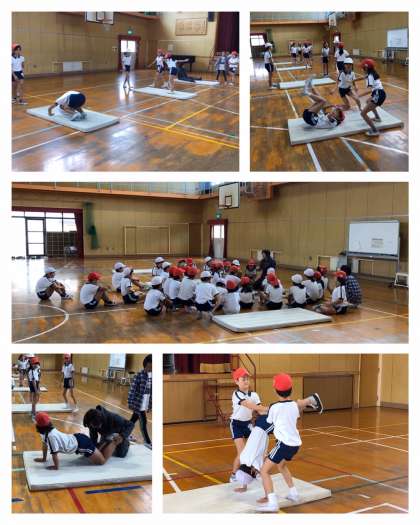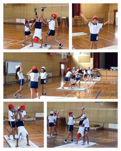 11月22日(金)2時間目、5年3組は体育館でマット運動の授業に取り組んでいました。倒立前転では、グループで補助をお互いにしながら上手に練習しています。マット運動では、的確な補助が技術の習得には欠かせません。後半は、後転。後ろに回って頭を越えるためにはどうすればよいのか。手の付き方やマットの支え方が重要です。校長先生からは、スピードをつける方法と脚の伸ばし方について、アドバイスをしてもらいました。繰り返し練習することで、技のコツをつかんでスムーズな後転になってきています。