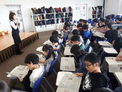 5年生も真剣に説明を聞いていました。新聞が形になるまでに細かな作業がたくさんあること、正確な情報のために何度も確認されることなど、たくさんのことを学びました。
