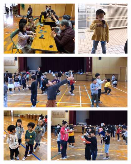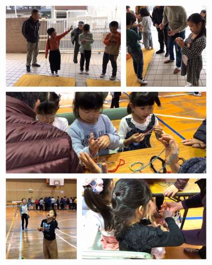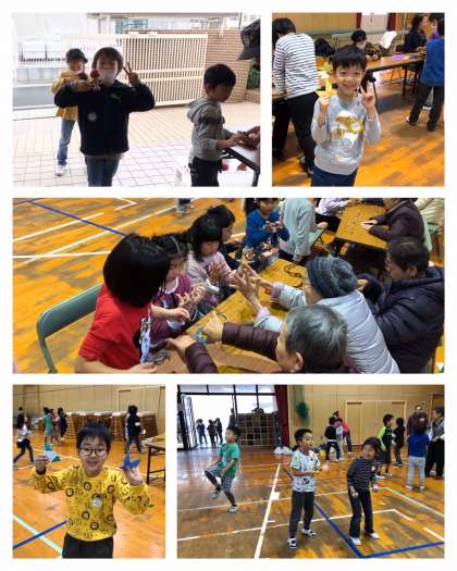 晴寿会の方々が、やさしくていねいに、遊び方を教えていただき、子供たちは大喜びで遊んでいます。こままわしは、難しそうです。校長先生も、こままわしのお手伝いをしたり、あやとりをしたりして子どもたちと一緒に遊んでいました。