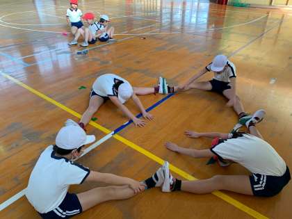寒いので、体育をする前にストレッチをしっかりと行います。
