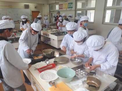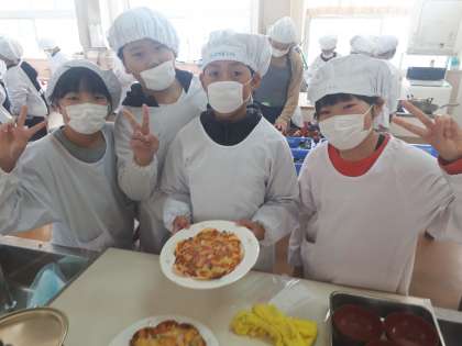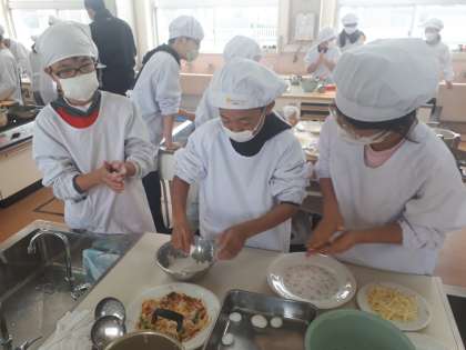家庭科「家族とほっとタイム」の調理実習で、かわりピザと白玉団子を作りました。