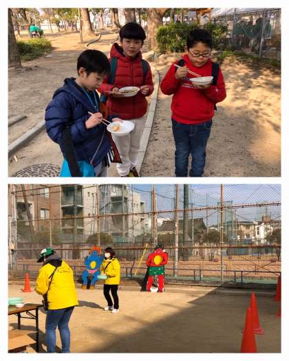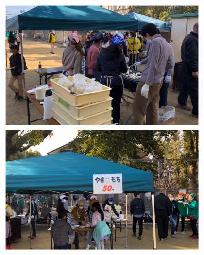 2月2日(日)、晴明丘中央公園において、晴明丘地域活動協議会主催のもちつき大会が開催されました。おだやかな晴天に恵まれ、多くの子どもたちも参加していました。PTAの役員や委員さんも「やきもち」の出店でお手伝いです。