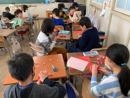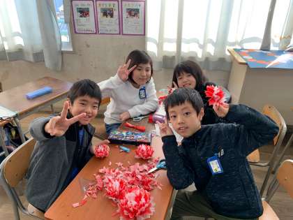 黒板や、名札を飾る花を作りました。