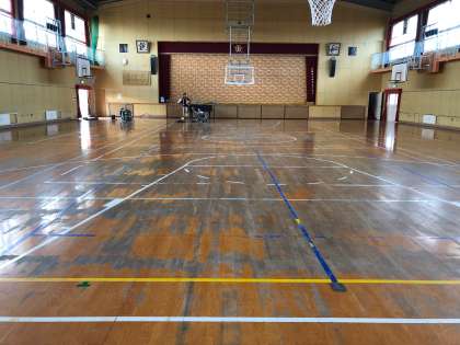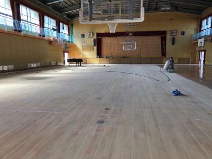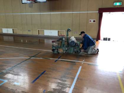 体育館の床が、長年の使用でかなり傷んでいました。本日より、改修工事に取り掛かっています。機械を使って、床の表面を削る作業をしています。