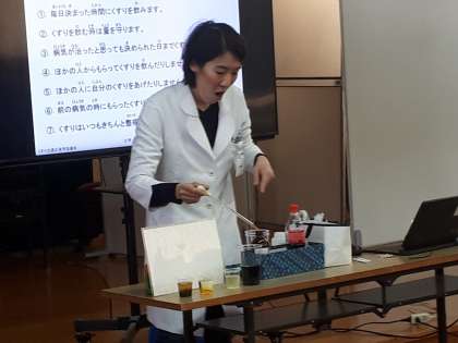 水以外でくすりを飲むとどうなるのか?!という実験をしていただきました。