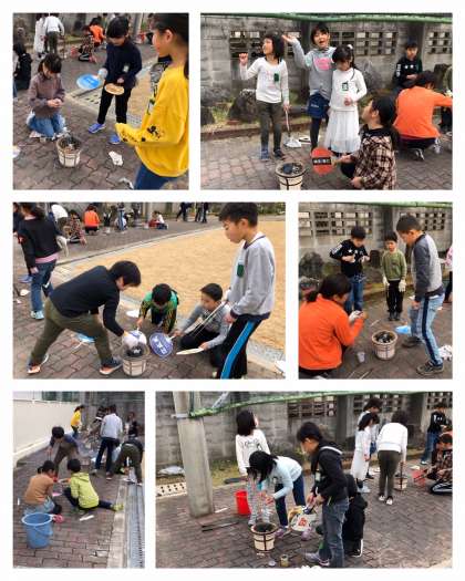 2月27日(木)2時間目、3年3組が芝生広場横で「火おこし」をしています。
