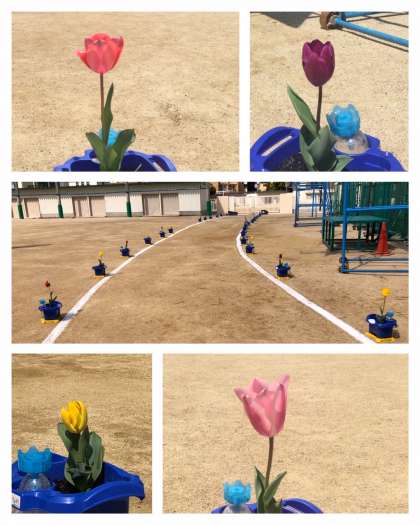 新型コロナウイルス感染症の拡大予防に向けて、できる限り密集にならないような配慮をしています。正門玄関で受付していただいた後、グランドを通って芝生広場の第2受付へ移動していただく通路に、1年生(新2年生)が栽培しているチューリップのプランターを並べました。