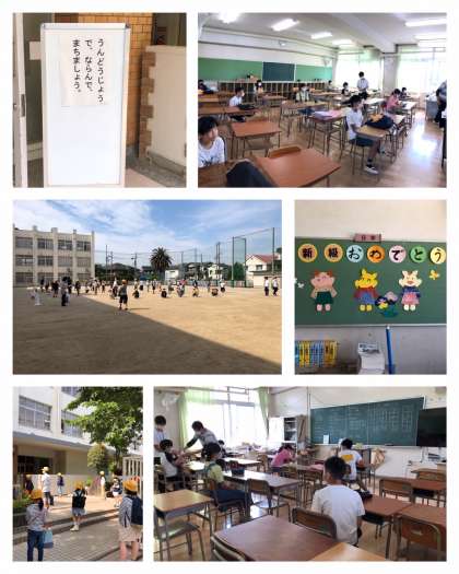 5月12日(火)、新学期になって初めての登校日です。2〜6年生1組のAグループが午前9時に登校。久しぶりに、正門で「おはようございます!」の元気な声が聞こえます。子どもたちは感染防止のために、マスクを着用し、距離をあけて整列しています。
