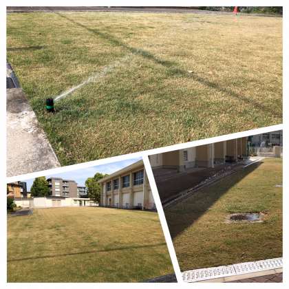 芝生に水やりをするために、自動散水(スプリンクラー)が作動しています。