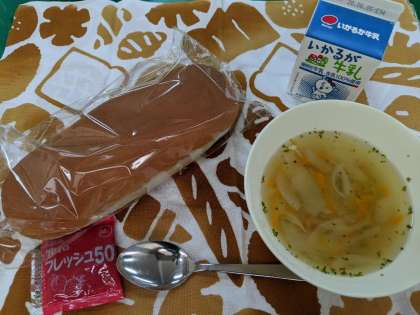 今日のこんだては、「コッペパン、いちごジャム、牛乳、スープ」です。