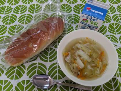 6月3日(水)のこんだては、「豚肉とキャベツのスープ、おさつパン、牛乳」です。