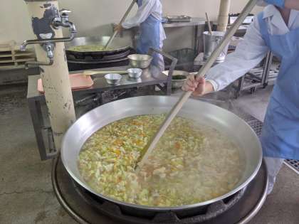 スープは、80リットル入る釜を2つ使って調理します。豚肉のうまみが出ていました。
