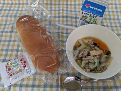 6月4日(木)のこんだては、「中華煮、コッペパン、りんごジャム、牛乳」です。