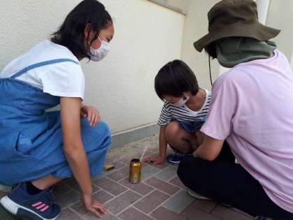 下の方に穴を開けた缶と穴が開いてない缶とで、わりばしの燃え方がどう違うのか調べています。