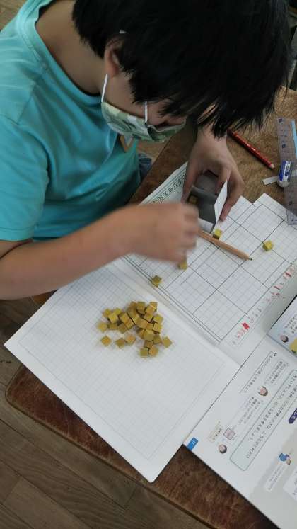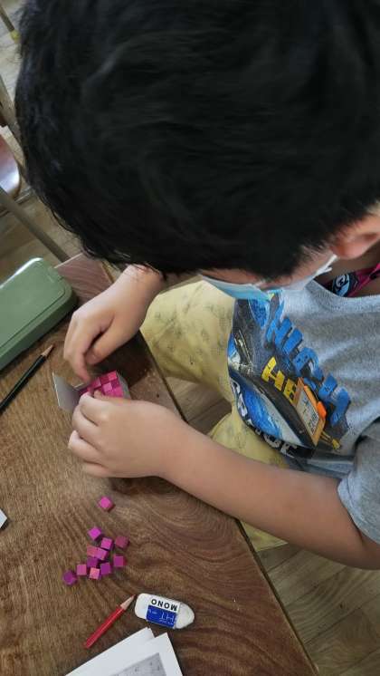 今日は、具体物を使って、実際に操作しながら、自分たちの予想がどうだったか確かめてみました。