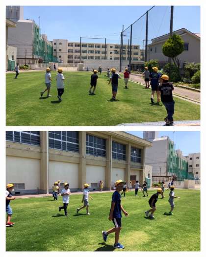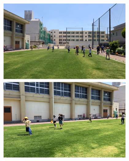 10分間の休み時間、元気に芝生広場を駆け回っています。