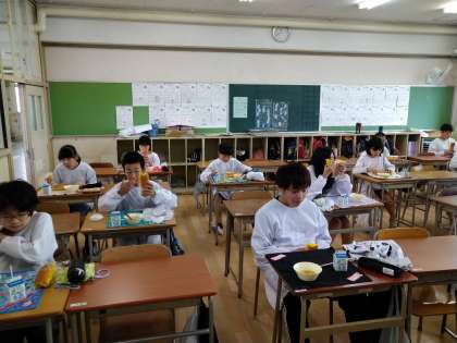 給食もみんなで前を向いておいしく味わっています。