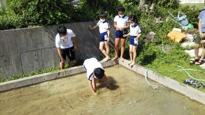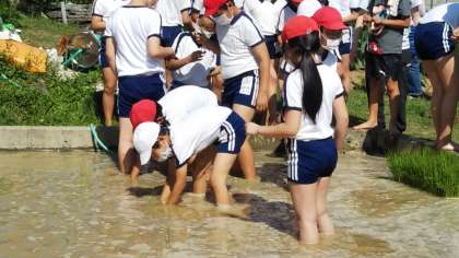 ぬかるむ土に素足で触れる感触に驚いたのでしょう、大盛り上がりで稲を植えていきました。