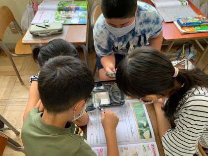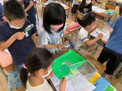 子ども達は、さなぎの色や大きさを観察し、さなぎの色が変わっていくことや、幼虫が4cmなのにさなぎが2cmということに驚いていました。