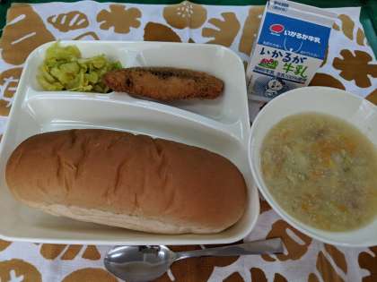 6月22日(月)のこんだては、「サーモンフライ、豆乳スープ、キャベツのカレーソテー、黒糖パン、牛乳」です。