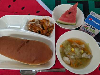 7月1日(水)のこんだては、「かぼちゃのミートグラタン、スープ、すいか、黒糖パン、牛乳」です。