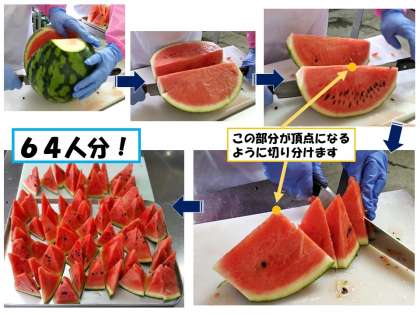 この切り方だと、いちばん甘い中心の部分がみんなに当たるように切り分けられます。1玉で64人分になります。