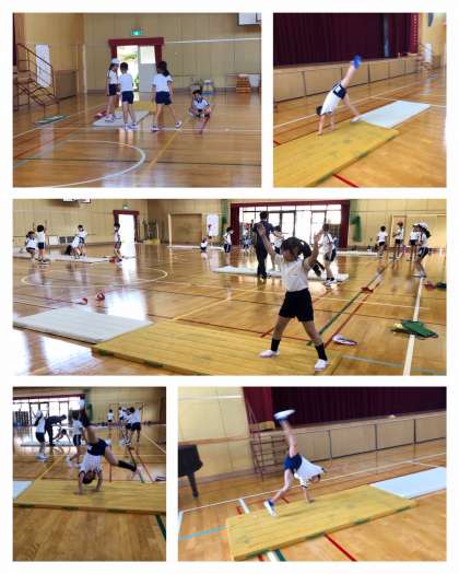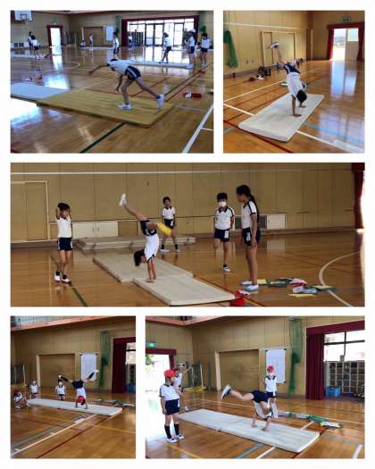前転の練習。前転で大事なことは、自分の体を使ってスピードを生み出すことです。小さくまるまるだけではスピードはつきません。回転の途中でひざ・腰を伸ばすことが大切です。側転の練習。練習のポイントは、4−2の記事を読んでください。