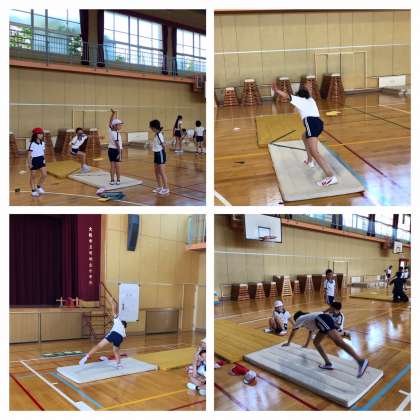 5時間目、4年1組のマット運動の様子です。