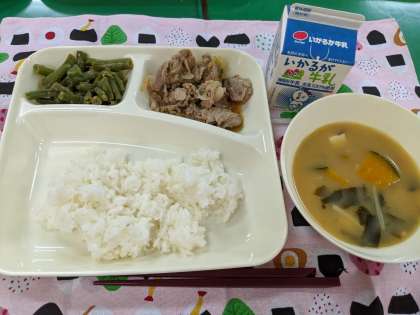 7月3日(金)のこんだては、「豚肉のしょうが焼き、みそ汁、三度豆のごまあえ、ごはん、牛乳」です。