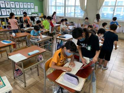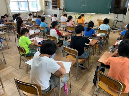 書き終わった児童は、他の友達のメモを見て回ったり、友達にメモの書き方をアドバイスしたりしていました。
