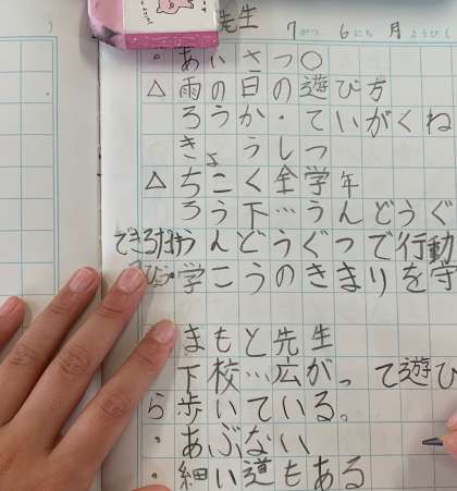 国語で取り組んだメモを取る学習を活かし、放送朝会の内容のメモを取りました。