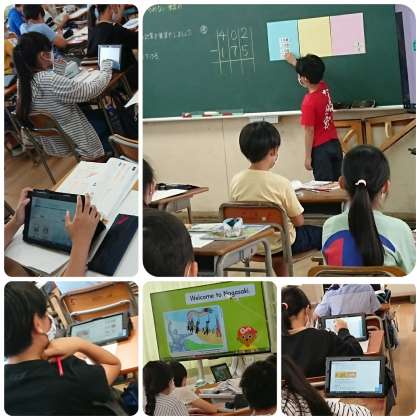 6年生は、タブレットを使って新聞づくりの内容を考えたり、大型テレビを使って英語の学習をしたりしていました。