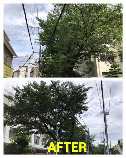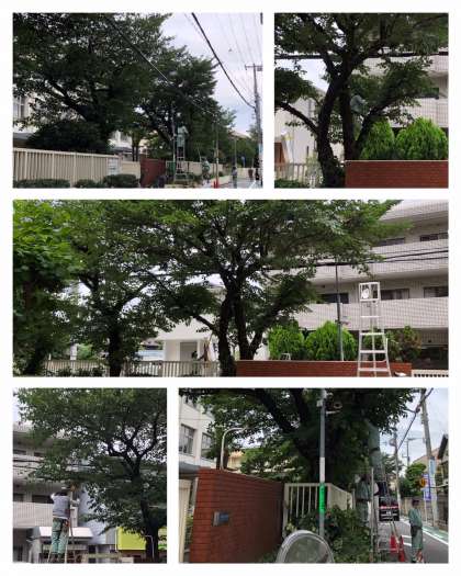 今日は、正門周辺の桜の木が電線に架かるほど伸びている枝を剪定していただきました。昨年、一昨年と大きな台風が大阪にも上陸し、大きな被害が出ています。桜の枝が折れて電線を切るようなことになると大変です。