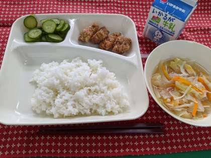 7月17日(金)のこんだては、「豚肉の香味あげ、すまし汁、あっさりきゅうり、ごはん、牛乳」です。