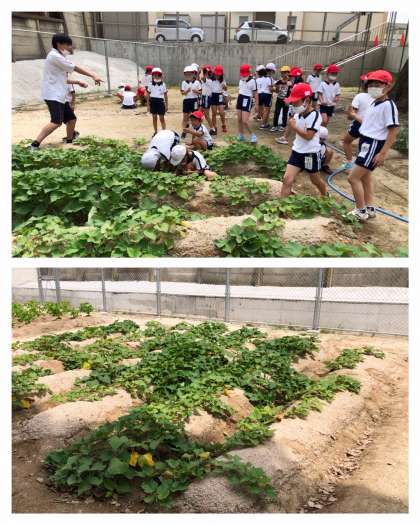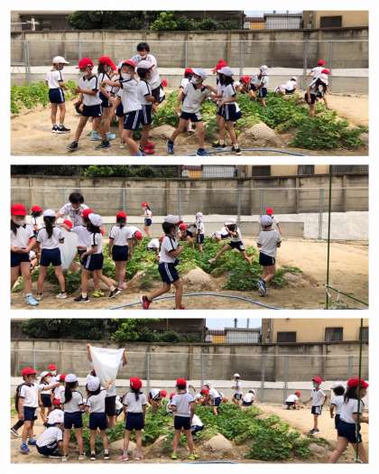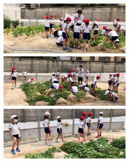 体育館での体育の後、くすのき広場の畑で育てている「サツマイモ」の手入れのために2年2組がやってきました。先日からの雨で、雑草が伸び放題になっていました。