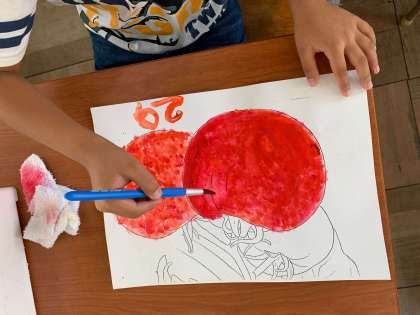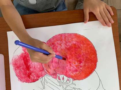 先週色を付けたトマトに立体感を出すため、塗った色の一部に水を付けて薄くし、トマトに当たった光を表現します。