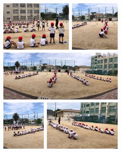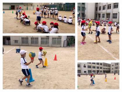 小さなカラーコーンにボールをのせて走ります。まるで聖火ランナーのようです。ボールを落とさないように上手に次の走者にバトンタッチ。