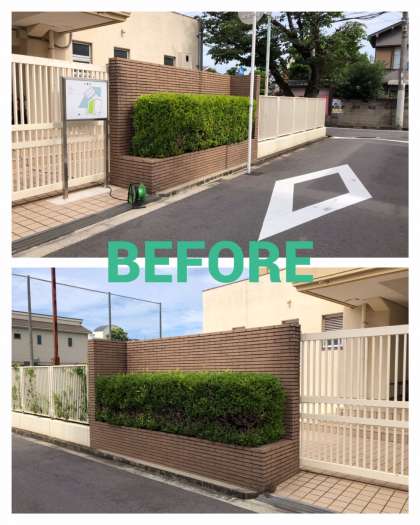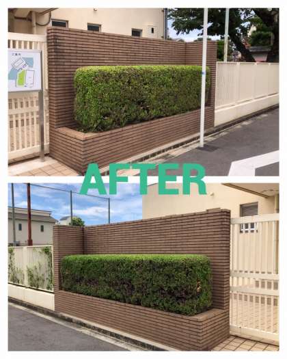 体育館入口の両サイドにある植込み。管理作業員さんがきれいにカッティング。
