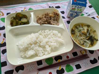7月28日(火)のこんだては、「豚肉のごまだれ焼き、五目汁、きゅうりのおかかあえ、ごはん、牛乳」です。